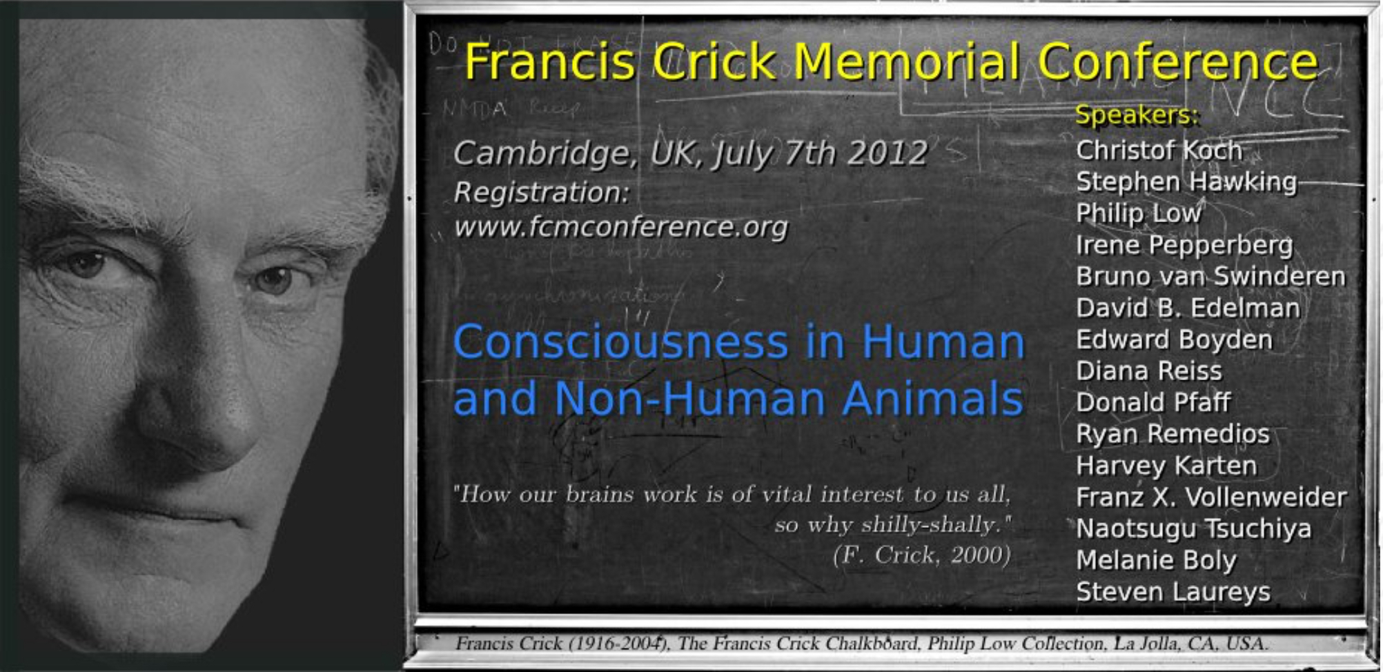 The Francis Crick Memorial Conference, focusing on “Consciousness in Humans and Non-Human Animals,” aimed to provide a purely data-driven perspective on the neural correlates of consciousness. The most advanced quantitative techniques for measuring and monitoring consciousness were presented, with the topics of focus ranging from exploring the properties of neurons deep in the brainstem, to assessing global cerebral function in comatose patients. Model organisms investigated spanned the species spectrum from flies to rodents, humans to birds, elephants to dolphins, and were approached from the viewpoint of three branches of biology: anatomy, physiology, and behavior. Until animals have their own storytellers, humans will always have the most glorious part of the story, and with this proverbial concept in mind, the symposium addressed the notion that humans do not alone possess the neurological faculties that constitute consciousness as it is presently understood.