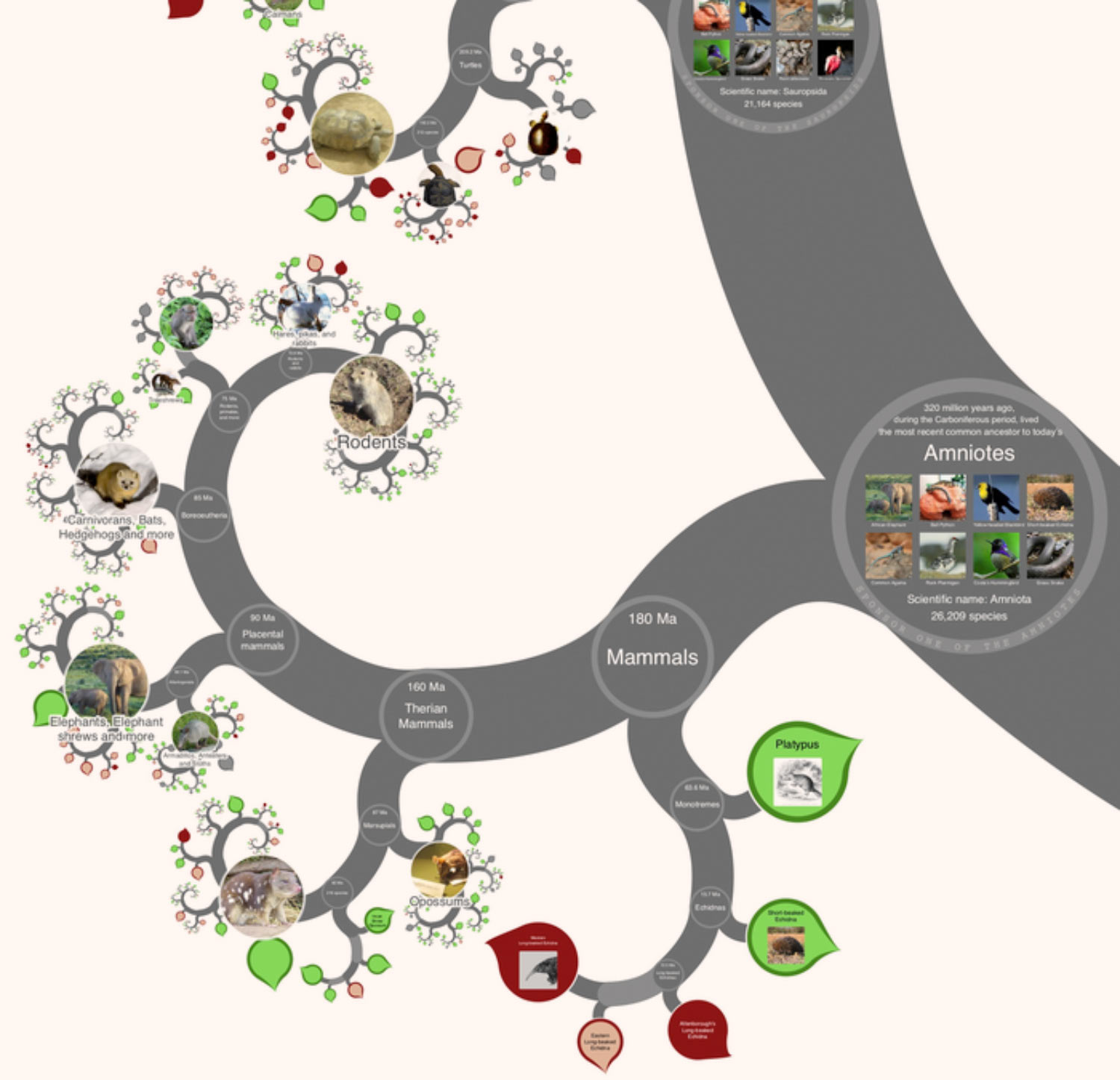 The Tree of Life shows how all life on Earth is related. In this interactive tree of life you can explore the relationships between 2,228,001 species and wonder at 105,498 images on a single zoomable page. Each leaf represents a different species, and the branches illustrate how these many species evolved from common ancestors over billions of years. Explore the relationships between species, learn about their common ancestors, or embark on a guided tour around the tree. Zoom around the tree to be amazed by the diversity of life on Earth.